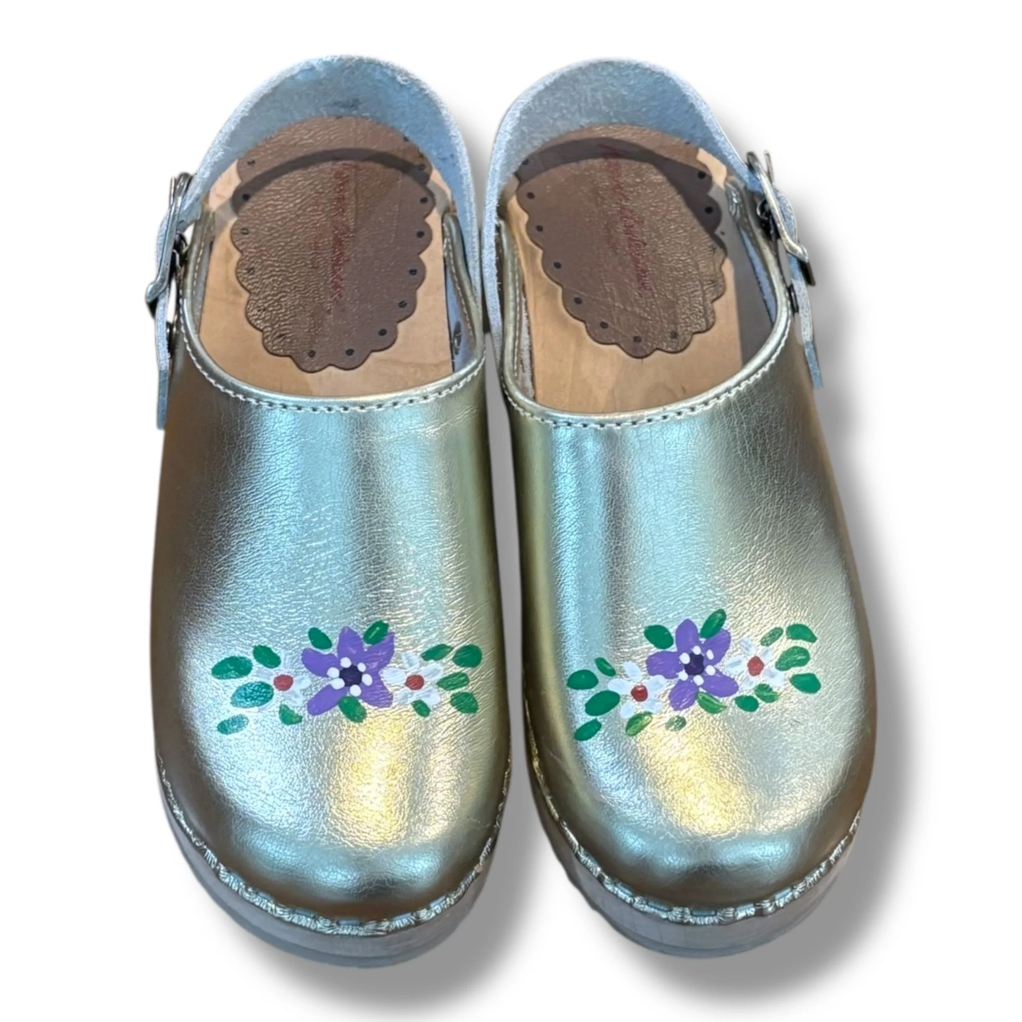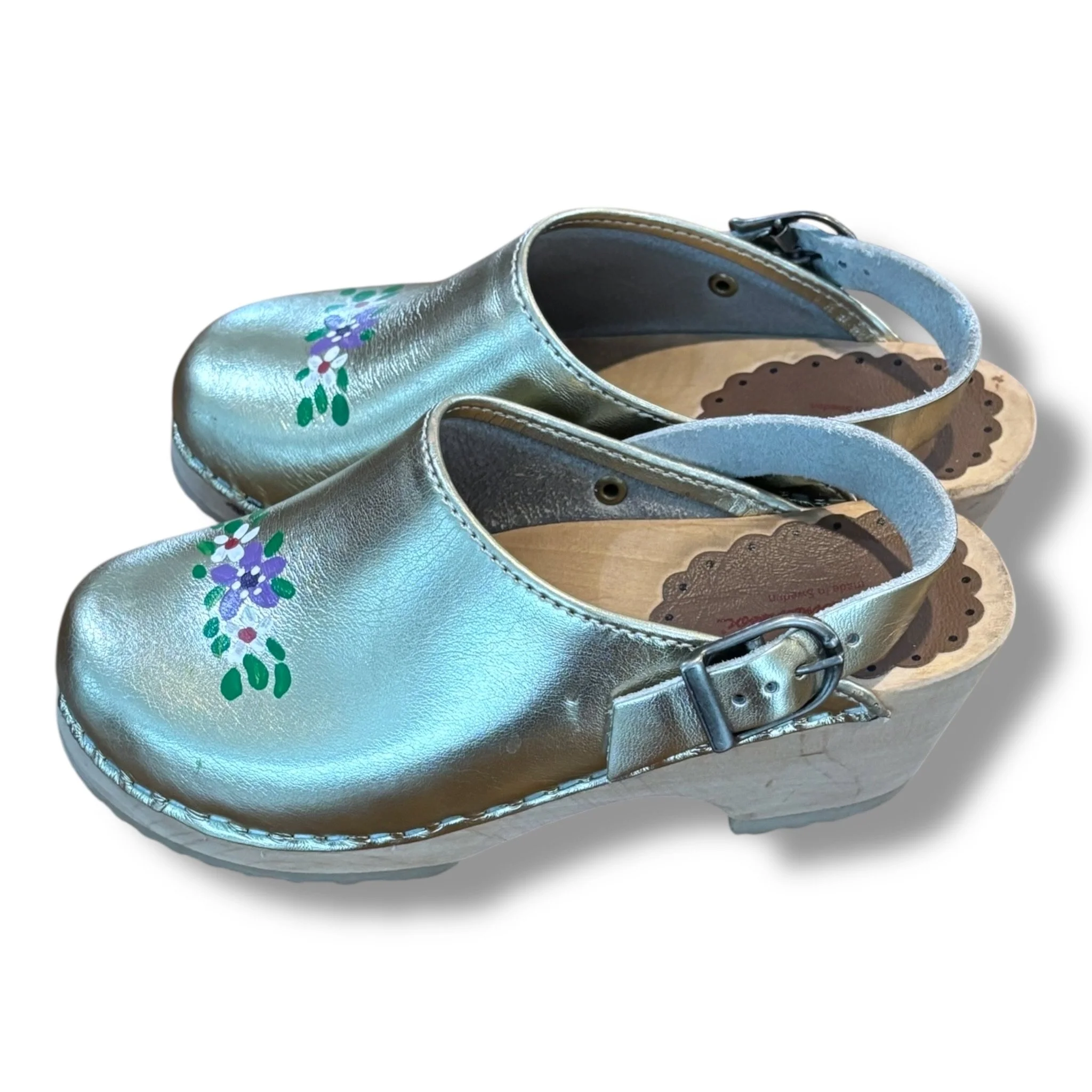 Size 7 Mini Melissa silver mary janes with silver/white flowers