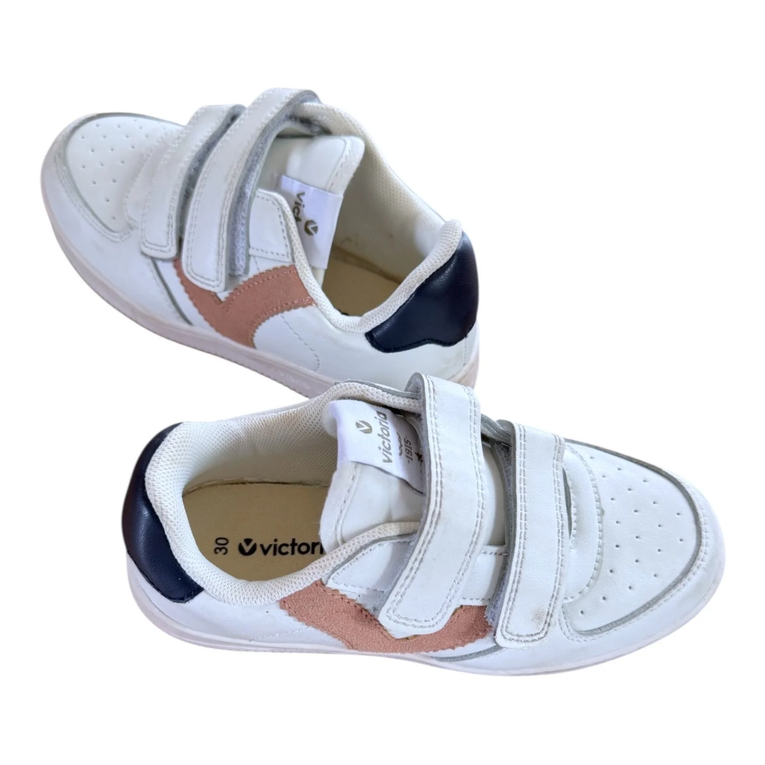 Boys shoes › Size 12 Victoria white velcro sneakers with tan 'V' and navy on back Image 1 of 1 Size 12 Victoria white velcro sneakers with tan 'V' and navy on back $14.00 Add To Cart Added!