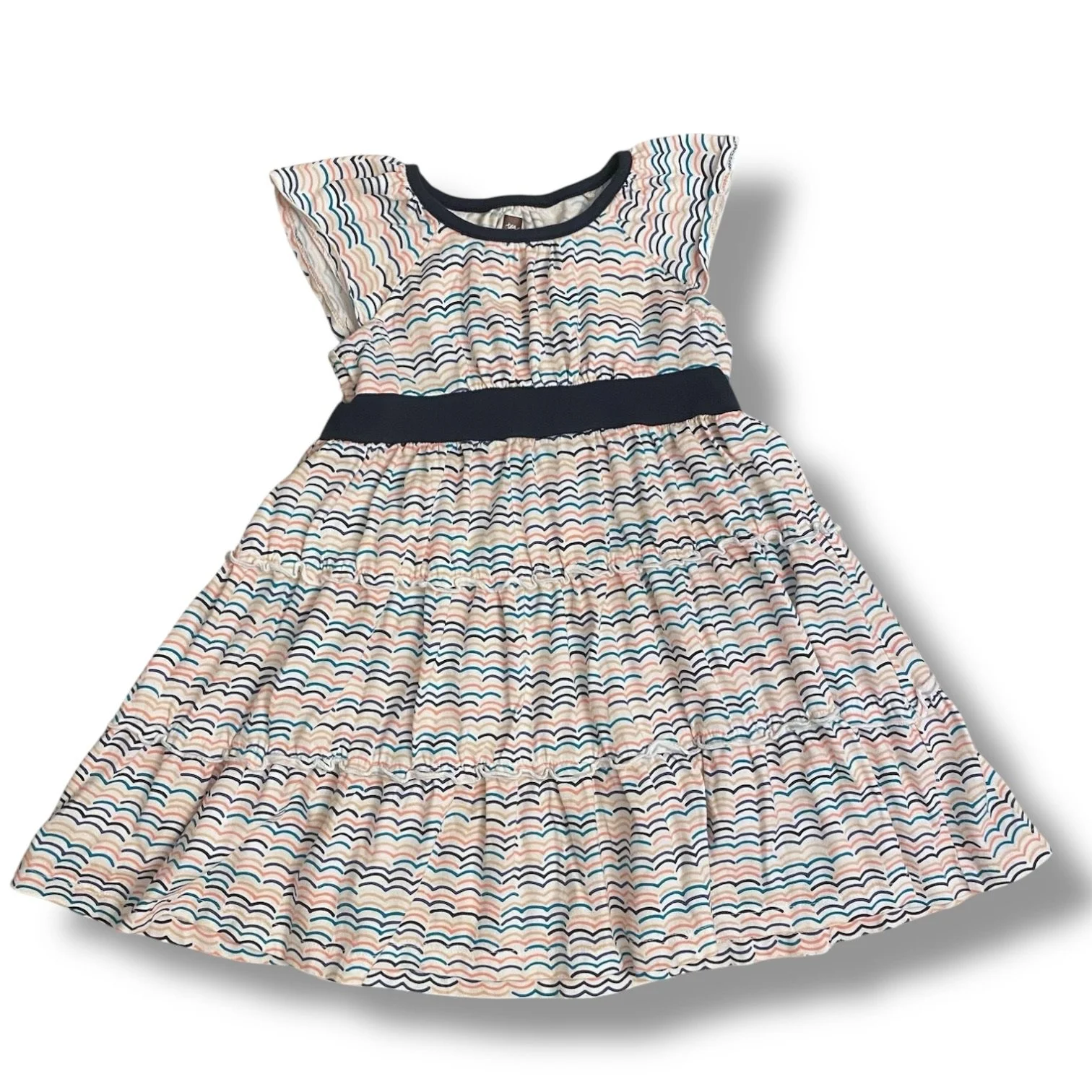 Size 3 Tea Collection colorful tiered short sleeve dress with thick navy striped across middle