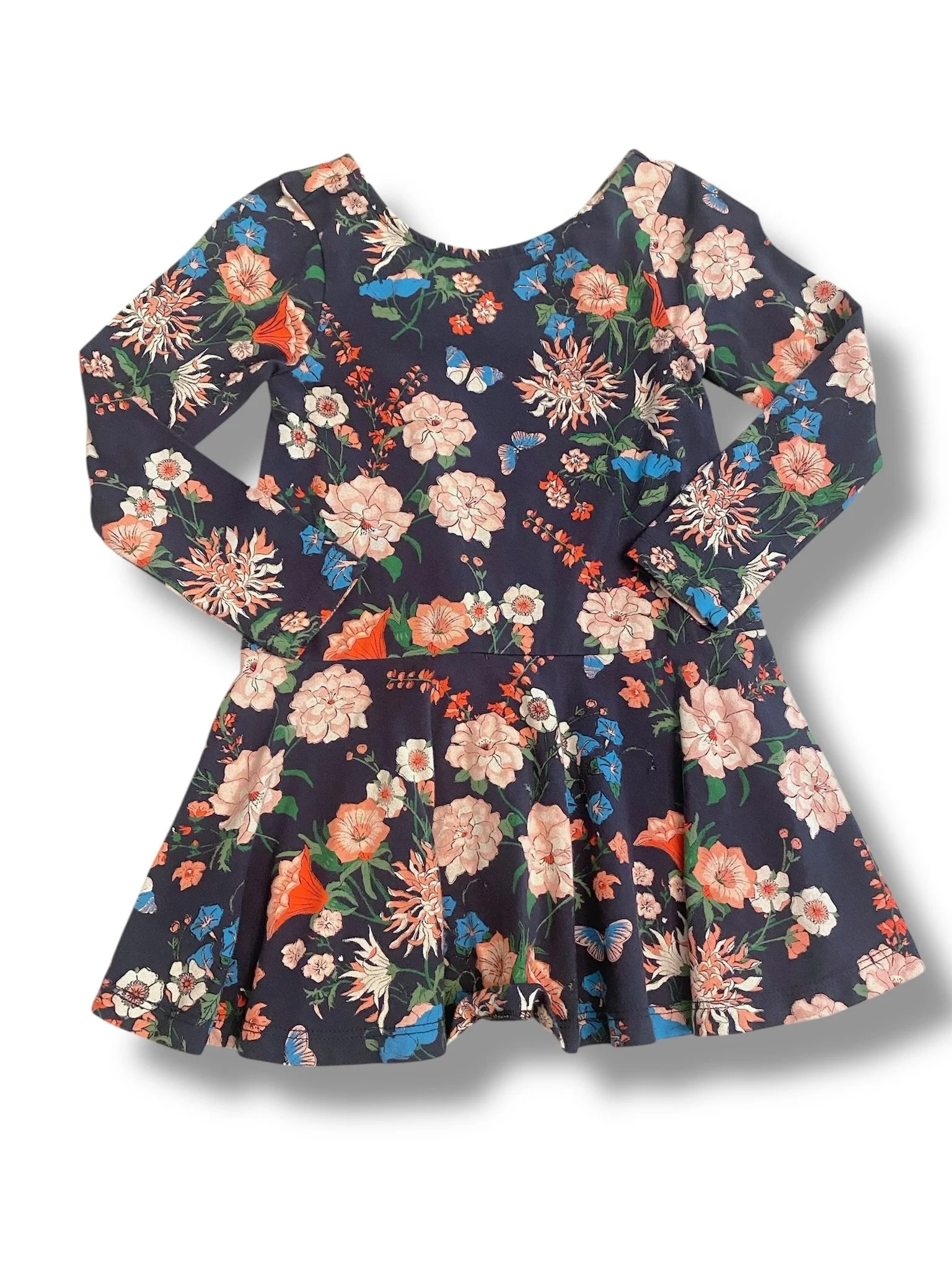 Size 2 Tea Collection navy floral long sleeve dress with pink and coral flowers
