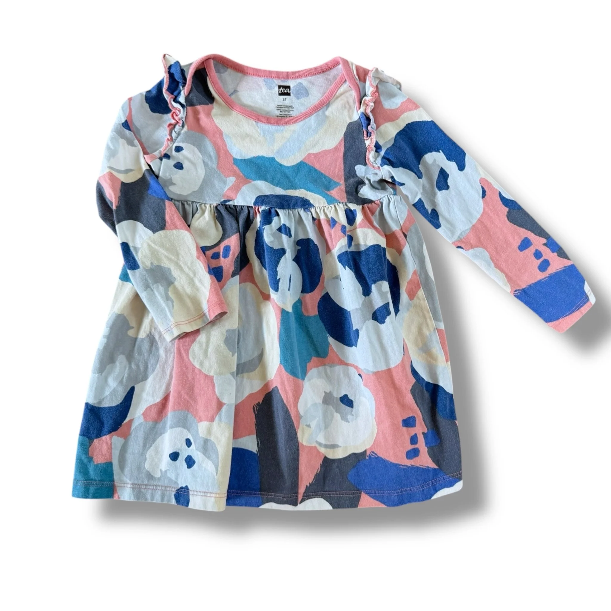 Size 3 Tea Collection long sleeve dress, pink, blue, gray and teal large floral abstract design