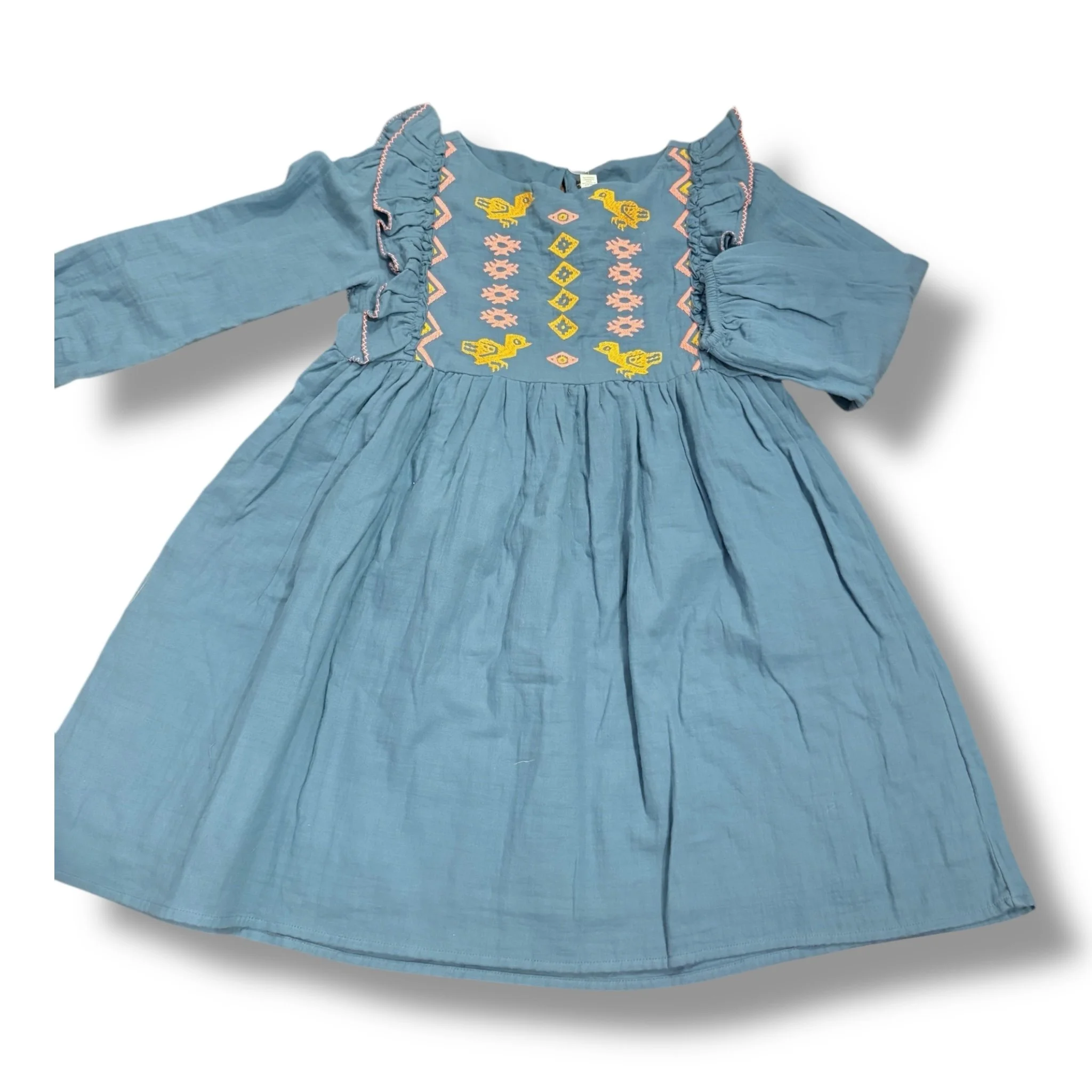 Size 10 Tea Collection dusty blue long sleeve dress with pink and yellow embroidery on top - NWT