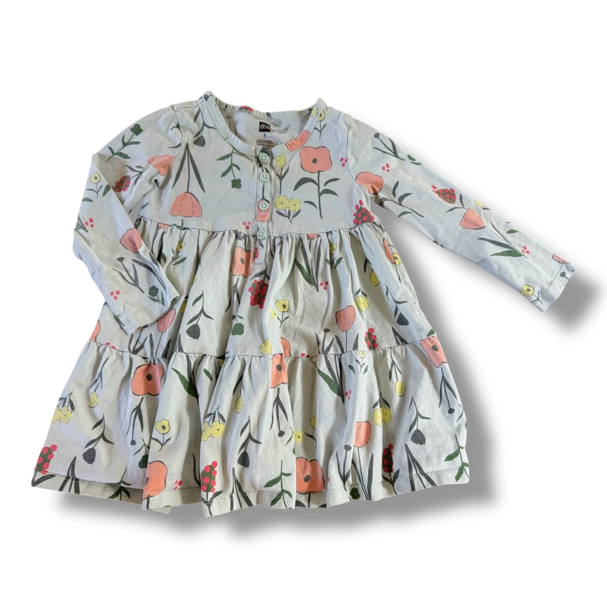 Size 2 Tea Collection blue long sleeve dress with bright flowers and button at the neckline