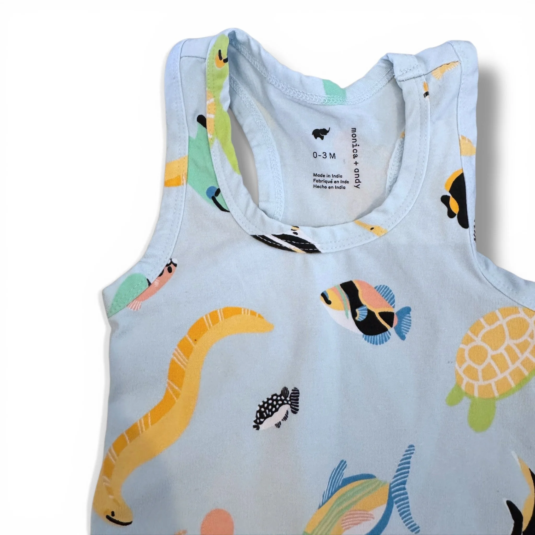 SHOP › Size 0-3 month Monica and Andy blue sea creature racerback shortall Image 1 of 2 Image 2 of 2 Size 0-3 month Monica and Andy blue sea creature racerback shortall $14.00 Add To Cart Added!