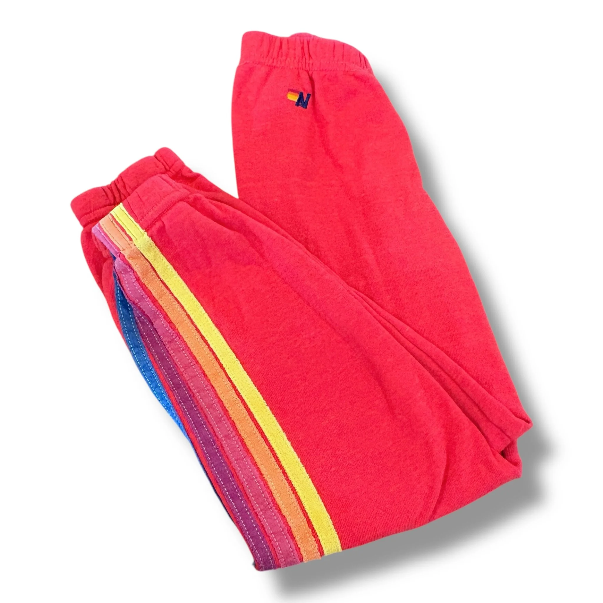 SHOP › Size 10 Aviator Nation red sweatpants with rainbow stripe down the side - mark on front Image 1 of 1 Size 10 Aviator Nation red sweatpants with rainbow stripe down the side - mark on front $34.00 Add To Cart Added!