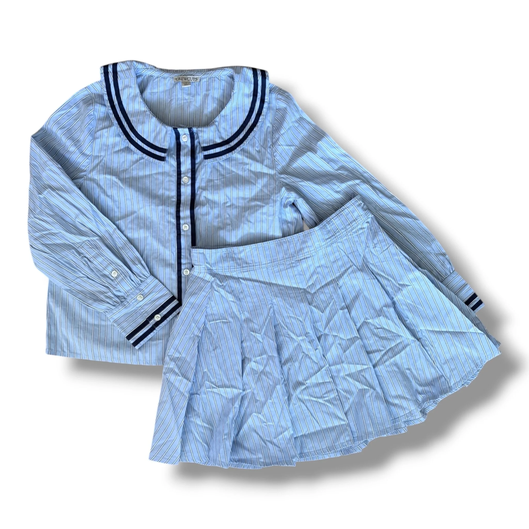 SHOP › Size 10 Crewcuts light blue/white striped long sleeve button down shirt and skirt set with navy trim detail Image 1 of 2 Image 2 of 2 Size 10 Crewcuts light blue/white striped long sleeve button down shirt and skirt set with navy trim detail $23.00 Add To Cart Added!