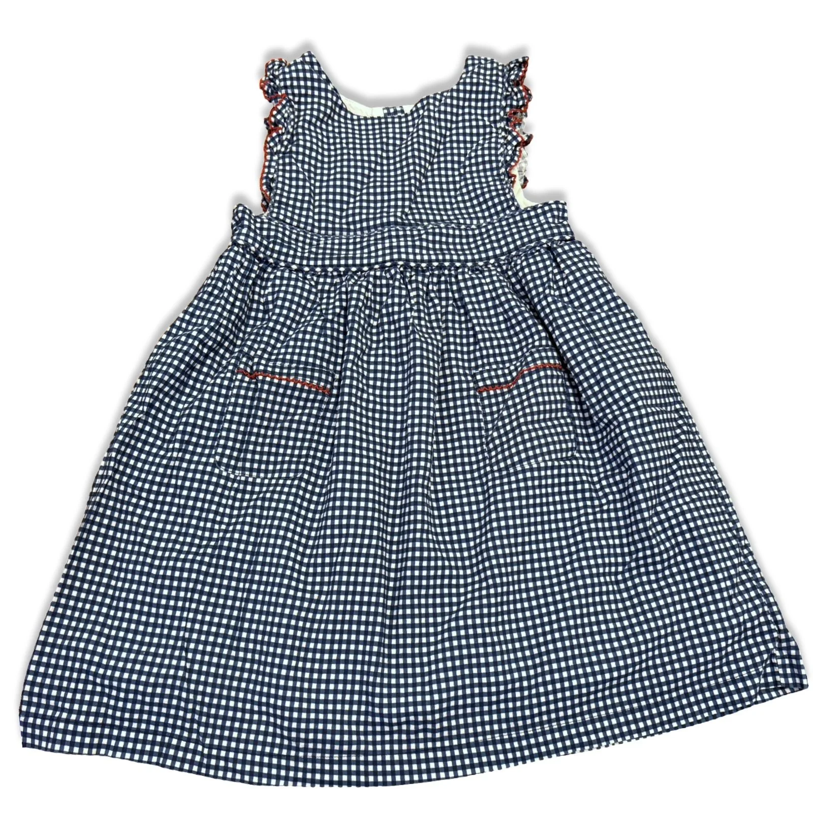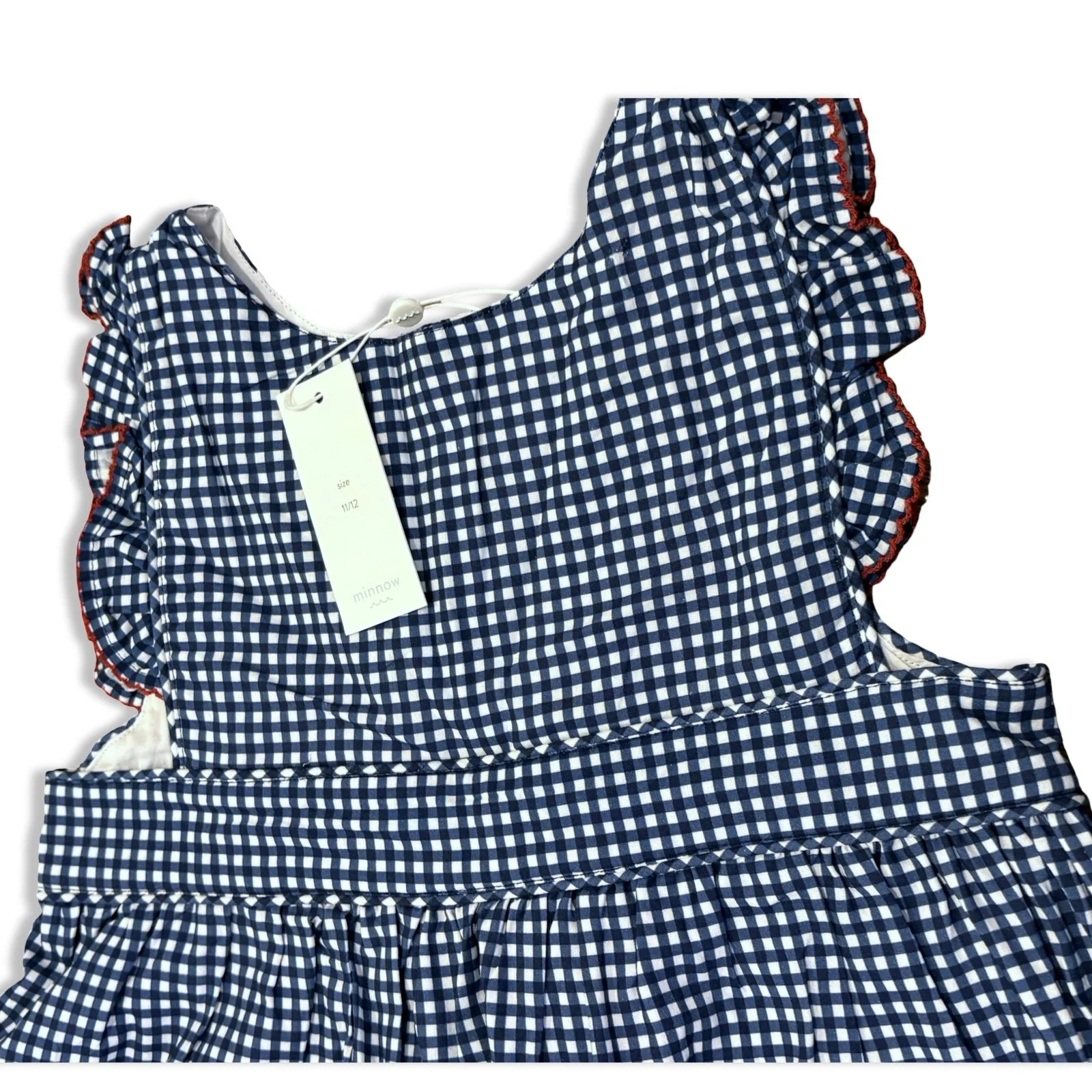 SHOP › Size 11/12 Minnow blue/white gingham dress with red trim and pockets in front NWT Image 1 of 3 Image 2 of 3 Image 3 of 3 Size 11/12 Minnow blue/white gingham dress with red trim and pockets in front NWT $38.00 Add To Cart Added!