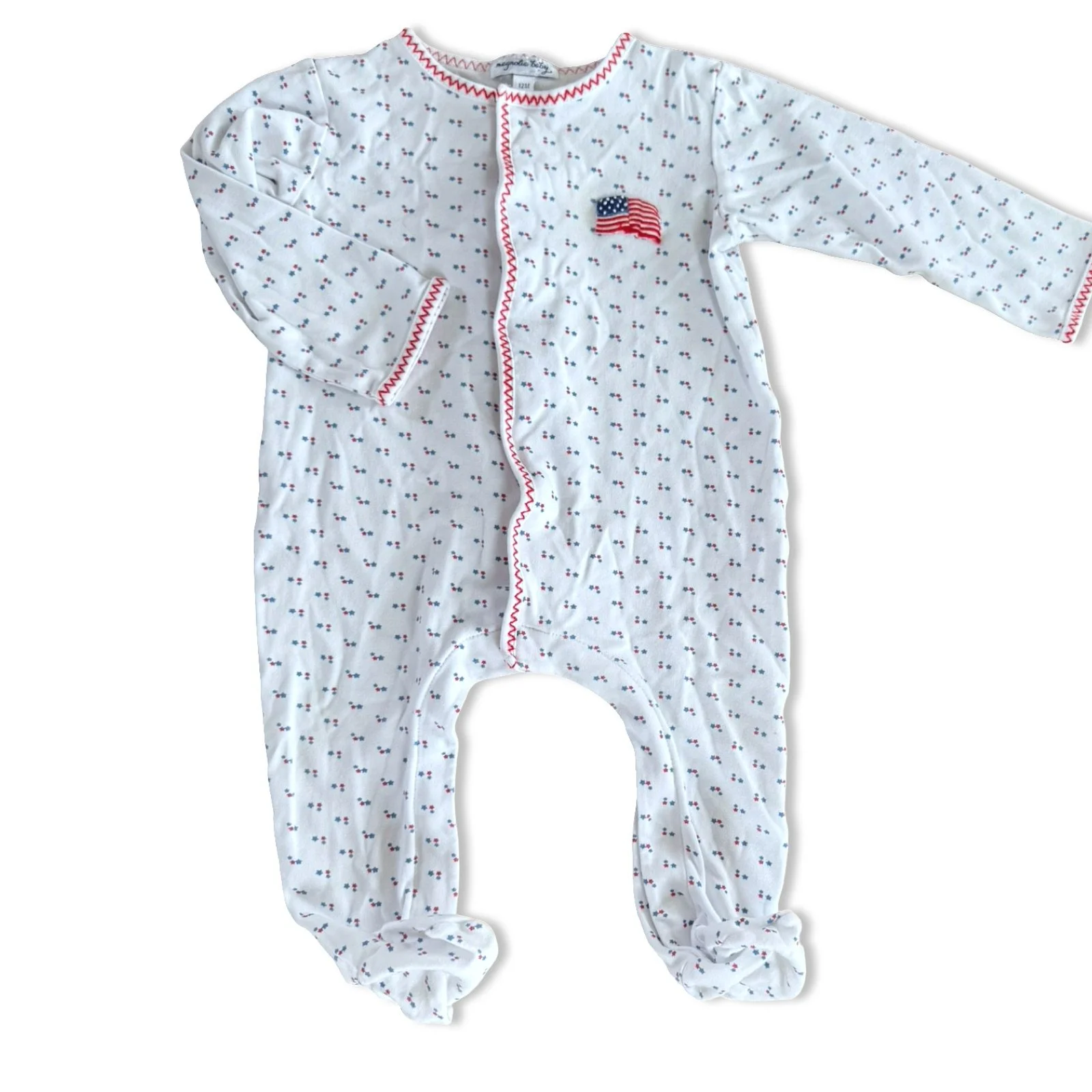 SHOP › Size 12 month Magnolia Baby white snap footie with blue, red stars, red zig zag stitching and American Flag Image 1 of 1 Size 12 month Magnolia Baby white snap footie with blue, red stars, red zig zag stitching and American Flag $14.00 Add To Cart Added!