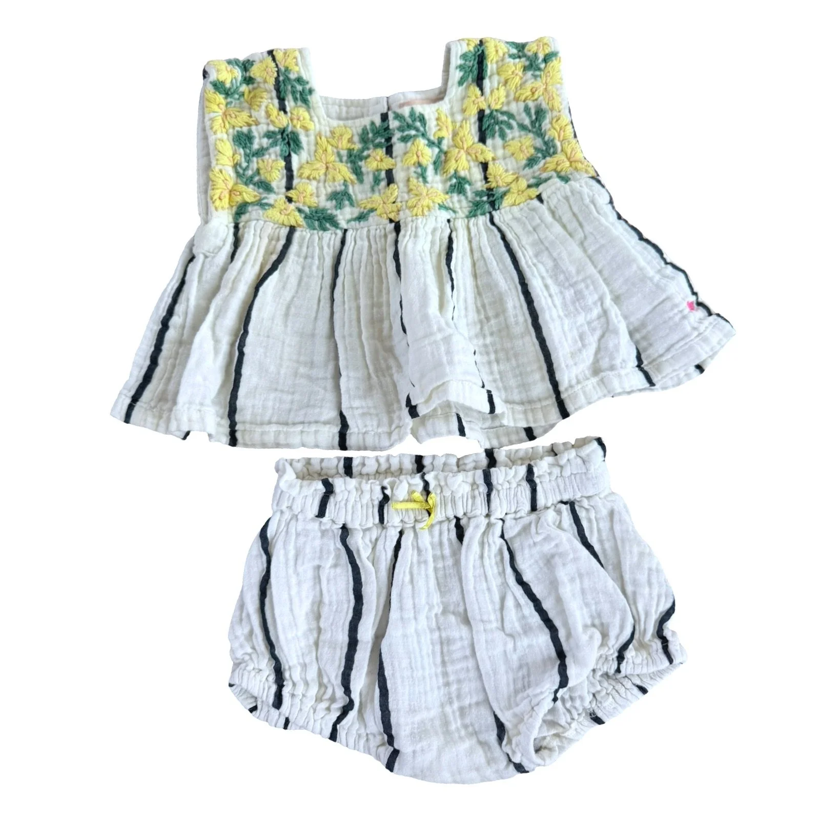 SHOP › Size 18-24 Pink Chicken white with black stripes and yellow flowers embroidered top with shorts Image 1 of 1 Size 18-24 Pink Chicken white with black stripes and yellow flowers embroidered top with shorts $32.00 Wash wear Add To Cart Added! Wash wear