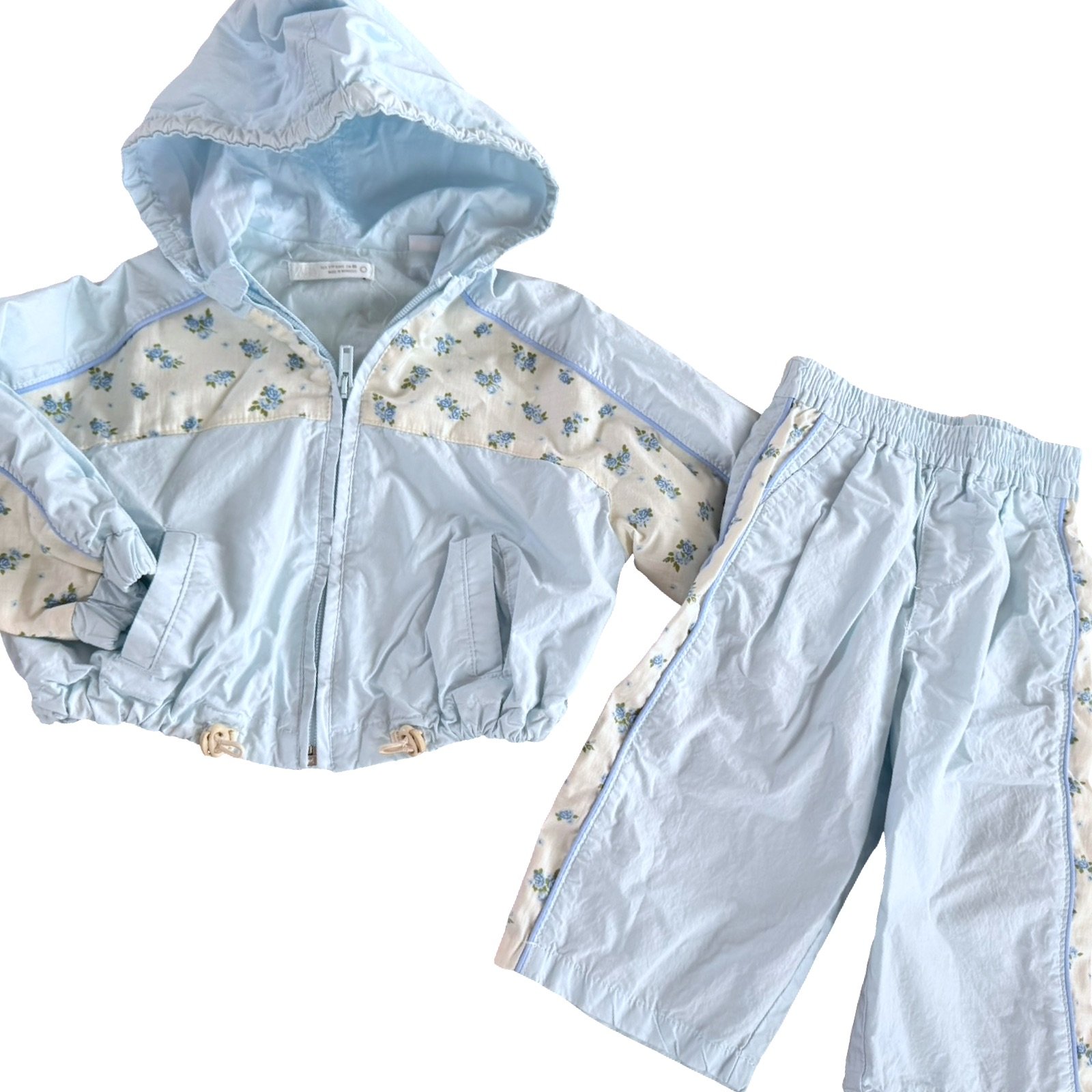 SHOP › Size 18 month Zara light blue light weight jacket with white, blue and green flower details with matching pull on pants Image 1 of 1 Size 18 month Zara light blue light weight jacket with white, blue and green flower details with matching pull on pants $26.00 2 piece set Add To Cart Added! 2 piece set