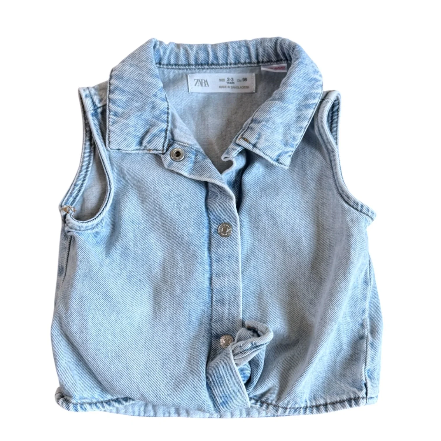 SHOP › Size 2-3 Zara denim sleeveless top with snaps and tie at waist Image 1 of 1 Size 2-3 Zara denim sleeveless top with snaps and tie at waist $14.00 Add To Cart Added!