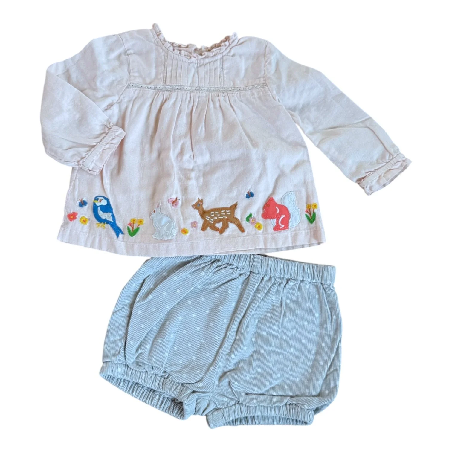SHOP › Size 3-6 month Boden gray shortie with white polka dots and pink top with would animal appliques Image 1 of 1 Size 3-6 month Boden gray shortie with white polka dots and pink top with would animal appliques $22.00 Add To Cart Added!
