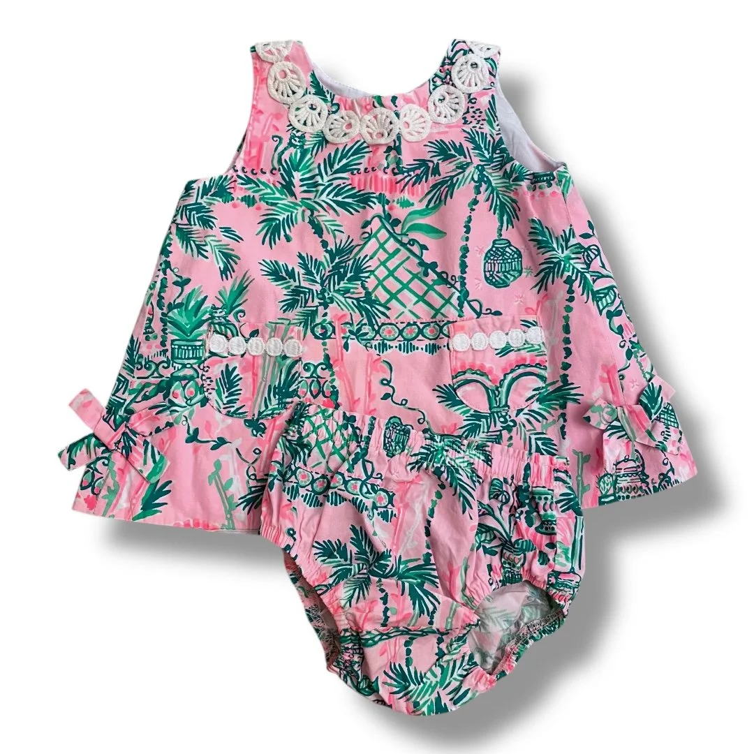 SHOP › Size 3-6 month Lilly Pulitzer bright pink and green tank set and bloomers, white embroidered on pocket and neckline Image 1 of 1 Size 3-6 month Lilly Pulitzer bright pink and green tank set and bloomers, white embroidered on pocket and neckline $26.00 Add To Cart Added!