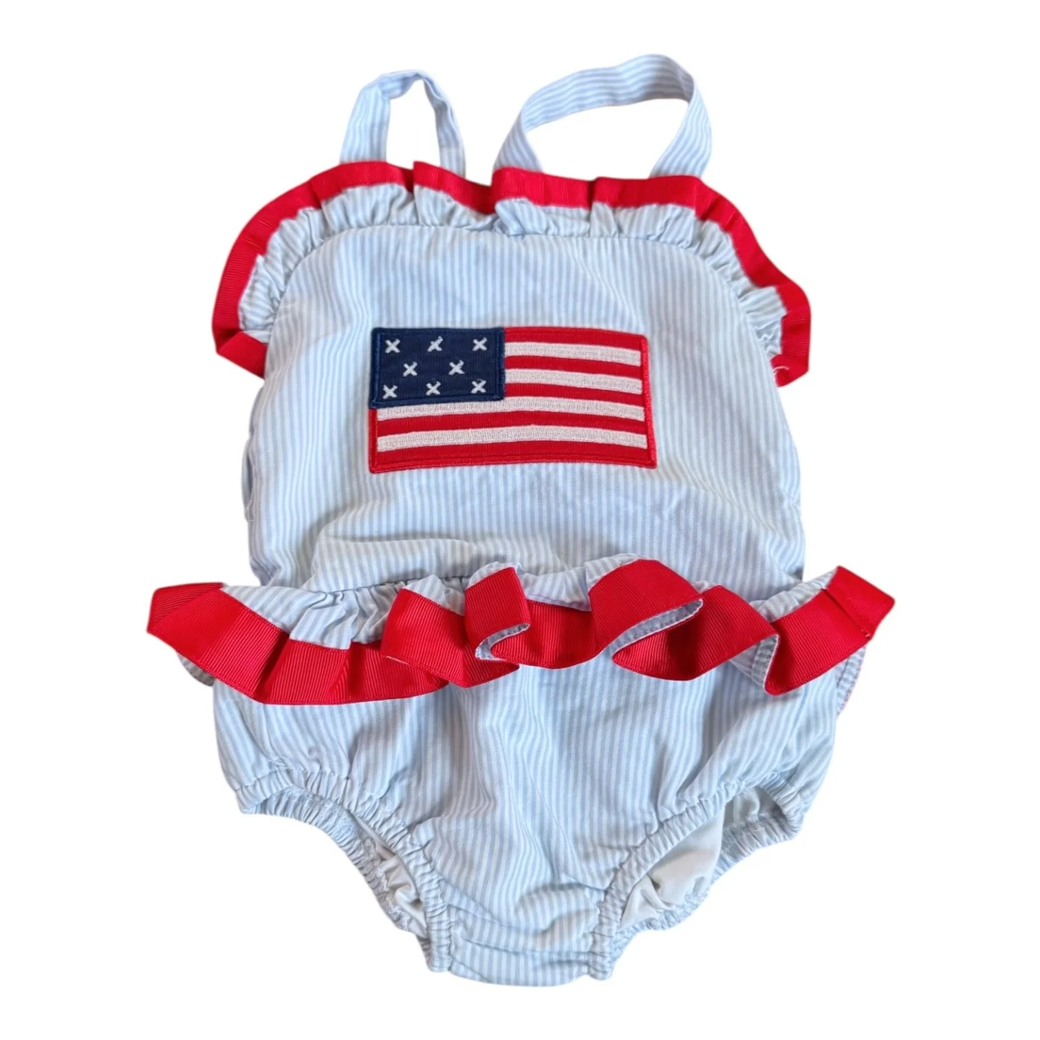 SHOP › Size 3 month Cecil & Lou blue and white stripe bubble romper American flag and red ribbon ruffles Image 1 of 1 Size 3 month Cecil & Lou blue and white stripe bubble romper American flag and red ribbon ruffles $17.00 Add To Cart Added!