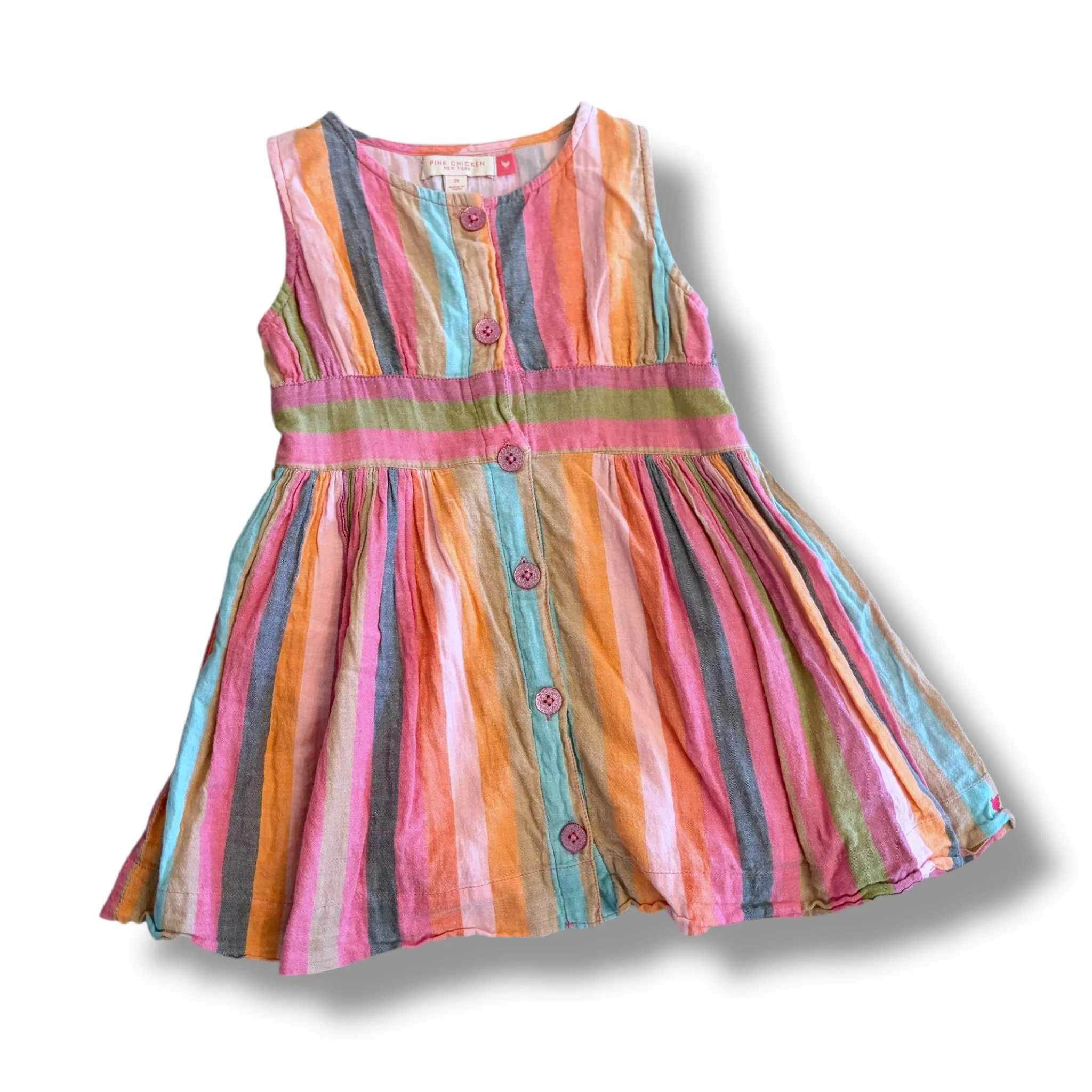 SHOP › Size 3 Pink Chicken orange/pink/teal vertical stripe dress with glitter pink buttons down the front Image 1 of 1 Size 3 Pink Chicken orange/pink/teal vertical stripe dress with glitter pink buttons down the front $38.00 Add To Cart Added!