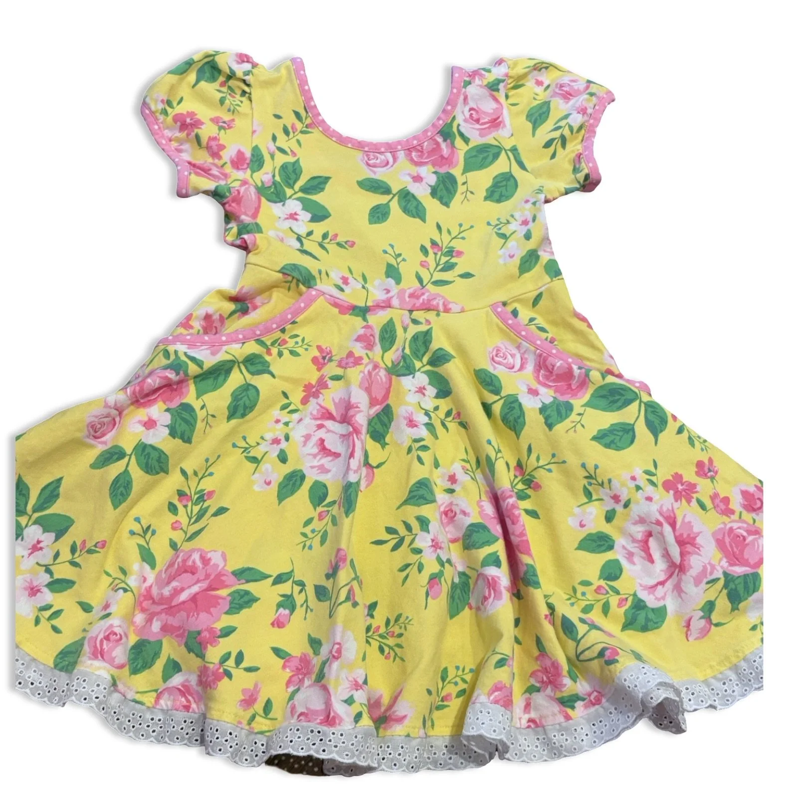 SHOP › Size 3/4 Elenor Rose yellow dress with pink flowers and pink polka dot trim Image 1 of 1 Size 3/4 Elenor Rose yellow dress with pink flowers and pink polka dot trim $15.00 Add To Cart Added!