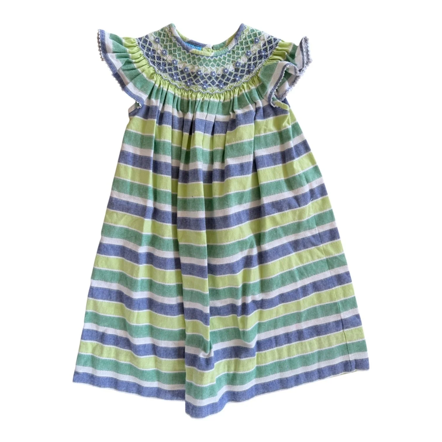 SHOP › Size 4 Anavini green, blue, white stripe dress with smocking with blue and white flowers Image 1 of 1 Size 4 Anavini green, blue, white stripe dress with smocking with blue and white flowers $25.00 Runs big. Fits 4-6 Add To Cart Added! Runs big. Fits 4-6