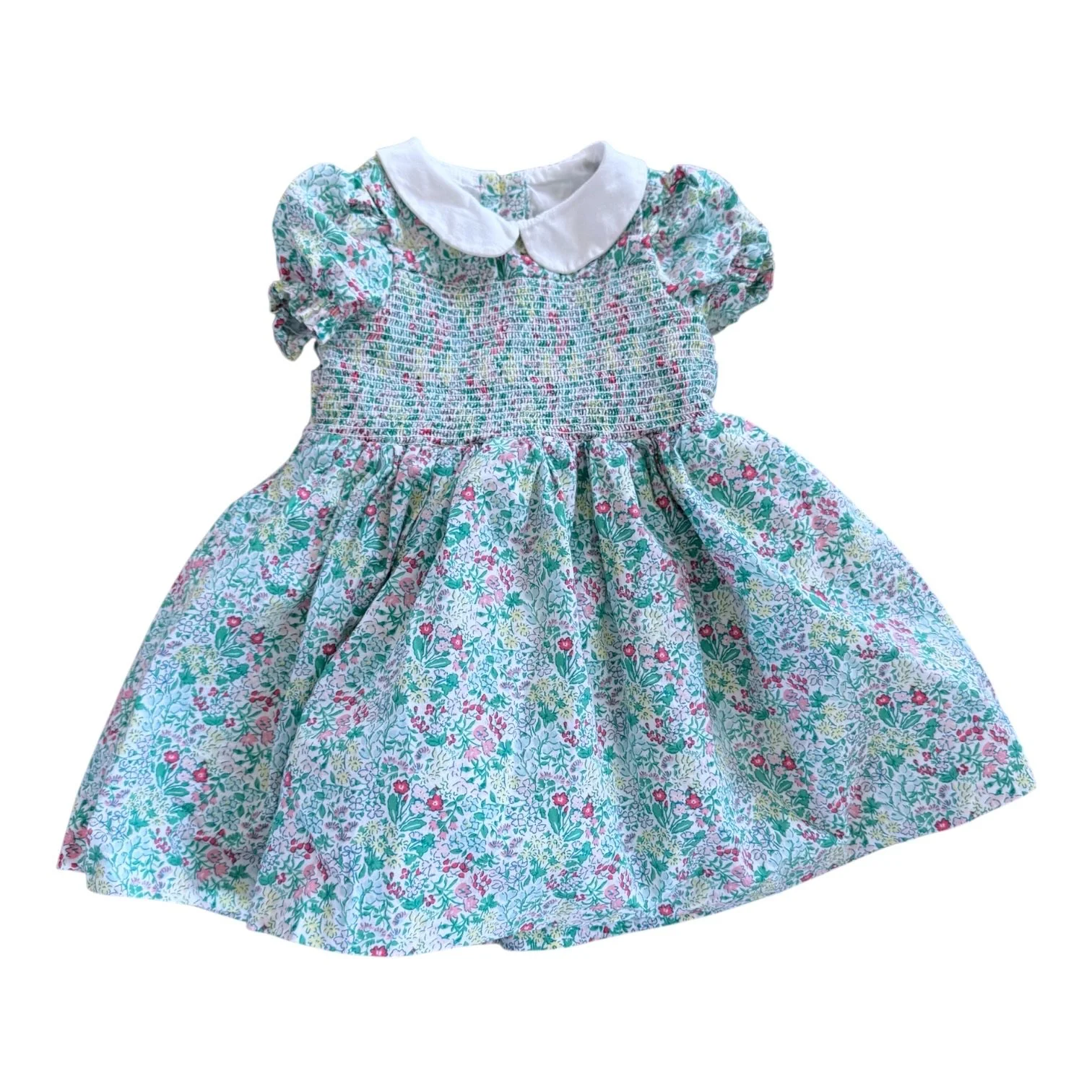 SHOP › Size 6-12 month Janie and Jack green, pink, blue and yellow floral short sleeve smocked dress with white collar Image 1 of 1 Size 6-12 month Janie and Jack green, pink, blue and yellow floral short sleeve smocked dress with white collar $18.00 Add To Cart Added!