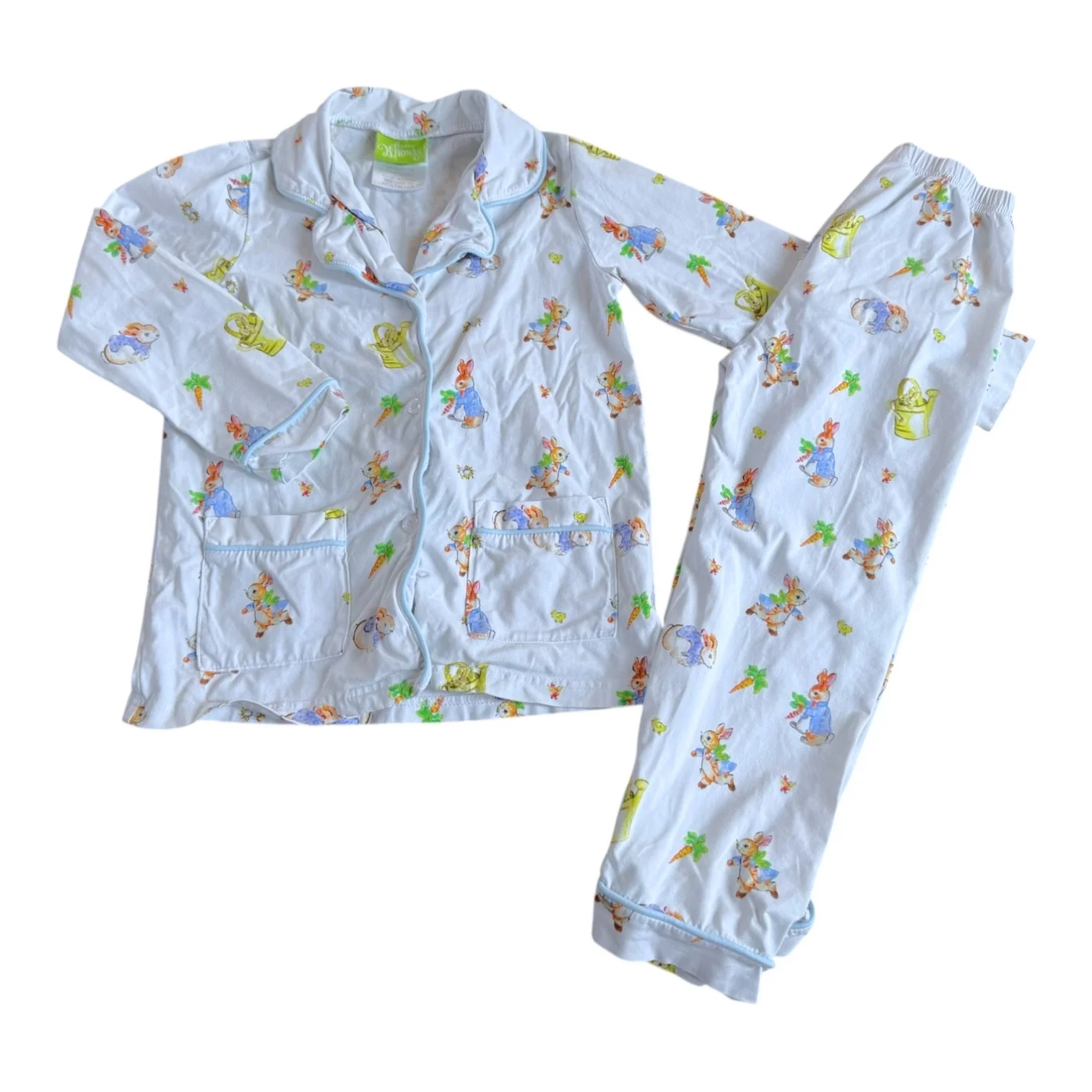SHOP › Size 6 Classic Whimsy white long sleeve pajama set with Peter Cotton Tail and light blue trim Image 1 of 2 Image 2 of 2 Size 6 Classic Whimsy white long sleeve pajama set with Peter Cotton Tail and light blue trim $19.00 Add To Cart Added!