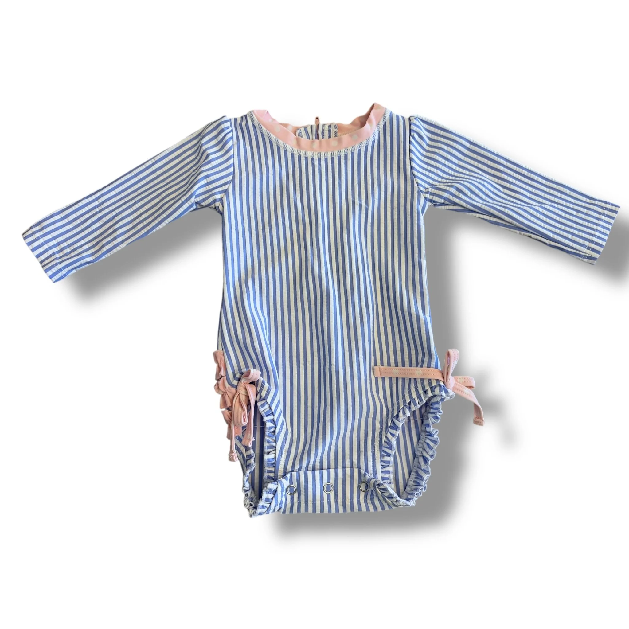 Swim › Size 6-12 Ruffle Butts blue and white seersucker long sleeve swim with light pink trim Image 1 of 1 Size 6-12 Ruffle Butts blue and white seersucker long sleeve swim with light pink trim $15.00 Add To Cart Added!
